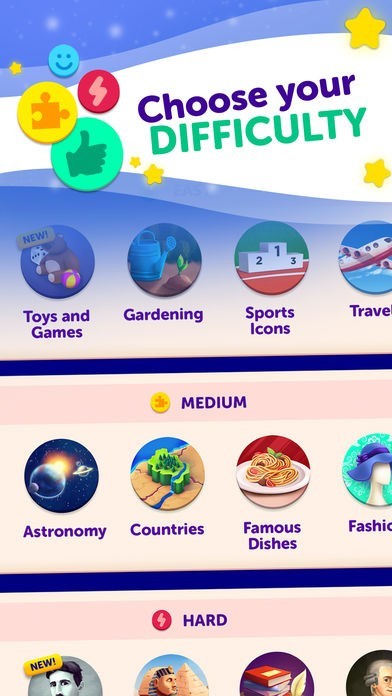 初級、中級、上級に加え、キッズレベルもあって、お子さまからご年配の方まで、みんなで楽しめるゲームです!何百ものレベルで、ぴったりのレベルがすぐに見つかり、モチベーションもしっかり保ちながらどんどん進んで、気づいたらすっかり博識になれちゃうかもしれません!