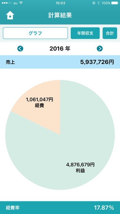 売上のうち、経費と利益の割合を簡単にチェックすることができます。それぞれの金額が表示されるのはもちろん、円グラフで表示されるので目で見て分かりやすいのが特徴です。