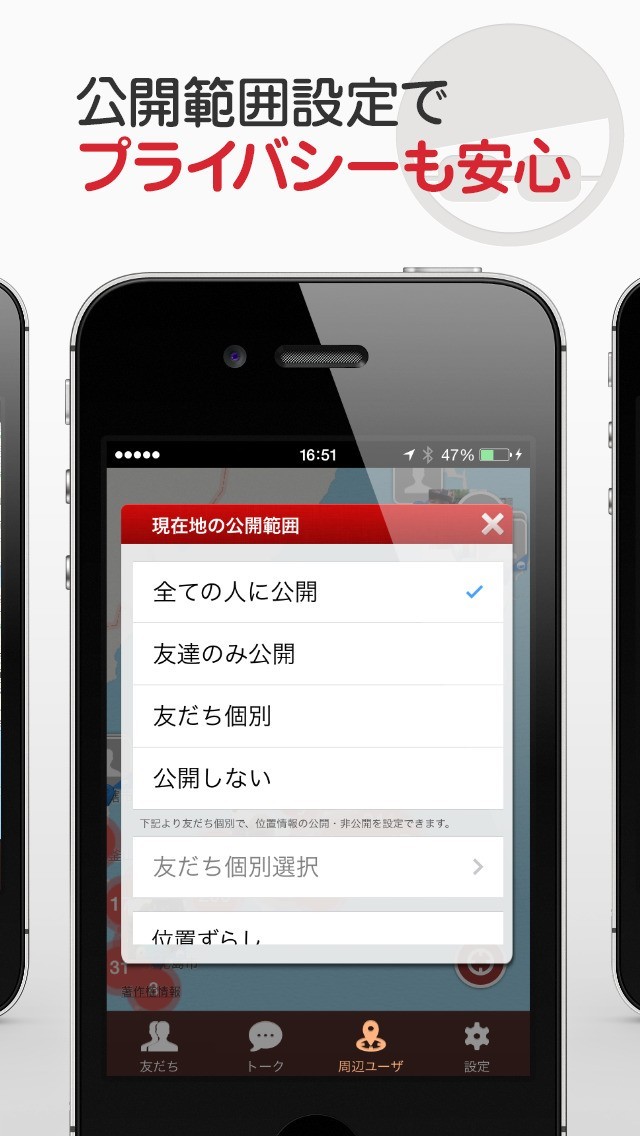 ユーザーのブロック機能や現在位置の公開制限などにより安全を確保できる