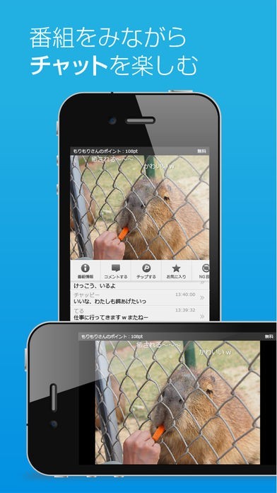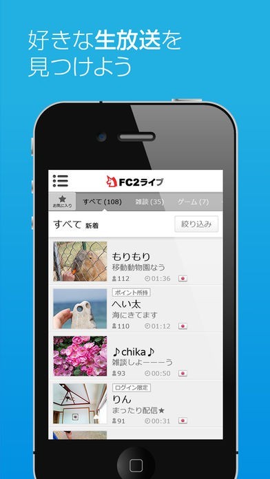 「FC2ライブ」は、個人や企業が配信する、雑談、ゲーム実況、屋外カメラ、などなど個性豊かな番組から好きなものを選んで見られるアプリです。チャット機能があるので、放送者と視聴者または視聴者同士でコミュニケーションを楽しめます。放送者がアンケート機能を利用することで、1つのテーマについて見ている人全員で投票した結果を共有して盛り上がることもできます。ユーザー登録なしで見られる番組も多いですが、ユーザー登録することで自分で番組を配信できるようになります。