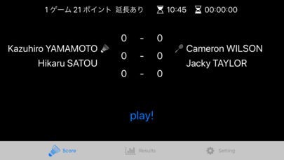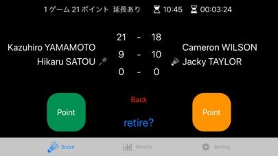 * プレーヤー名、サーバー・レシーバー、ゲーム数、ポイント数、試合開始・経過時間の表示