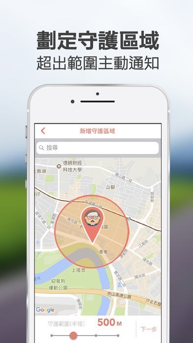 ● 自行設定守護區域:在App自行設定多個守護範圍(如:住家、學校),裝置一旦離開此範圍,會依設定之偵測頻率(15分、30分、1小時)來通知您。