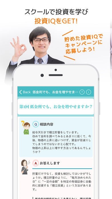 投資や経済についての情報を配信するアプリです。ロボット・アドバイザー機能では自分にぴったりの投資を教えてくれます。また、ロボット・アドバイザーの診断によって「投資IQ」を貯めることができます。