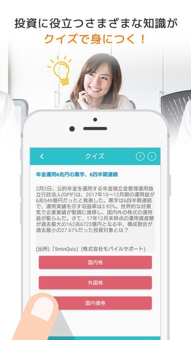 クイズ機能を搭載しています。クイズでは時事ニュースを出題。平日は毎日出題されるクイズに答えることで、投資についての知識を身につけることができるようになっています。
