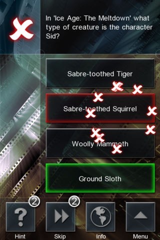 The slick multiple-choice interface lets you quickly choose from the possible answers. Earn additional Hints (which remove 2 wrong answers) or Skips (letting you dodge the questions you don't know) and develop your career to make it in Hollywood.