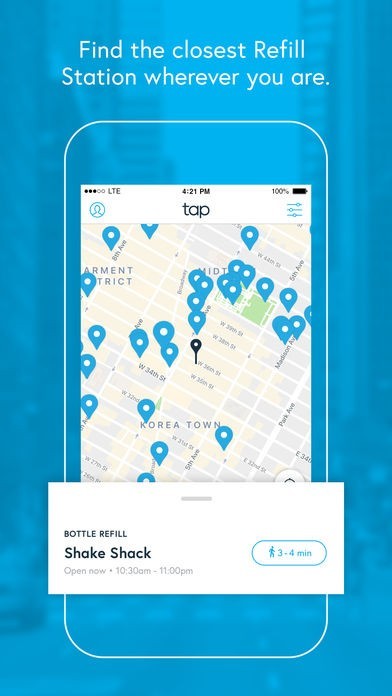 App Storeより引用Tap is an app that allows you to find nearby Refill Stations, so you never have to buy bottled water again. You just open the app and within seconds you’ll find the closest place to refill your water bottle.