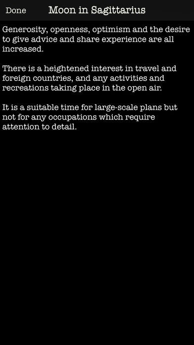 占星術では月の位置と星座の位置が対応したときに意味が生まれるのですが、アプリ内でそのときの月の位置がもつ意味について簡単に解説されています。あくまで簡易的な解説ではありますが占星術のエッセンスを身近に感じることができるでしょう。