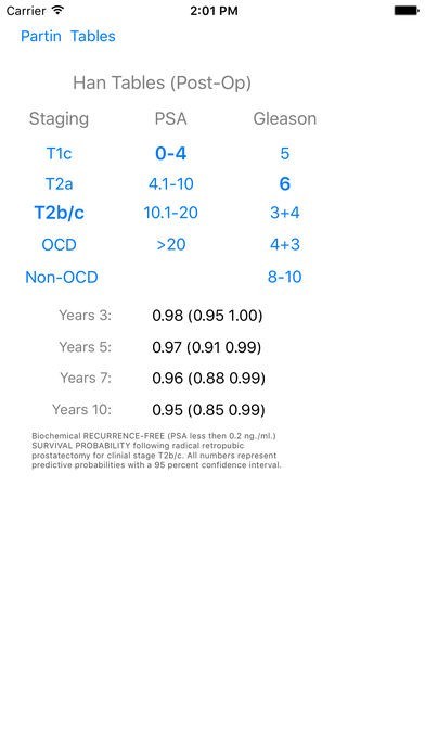 The “Han Tables” were developed by urologists, Misop Han, M.D., Alan W. Partin, M.D., Ph.D., and Patrick C. Walsh, M.D.. The Han tables were designed to predict the probability of the first evidence of recurrence (detectable PSA level) following surgery. Like the Partin Table Lookup described above, the Han Tables correlate the three common factors known about a man’s prostate cancer – PSA, TNM, and clinical stage – in order to predict the probability of recurrence up to 10 years following surgery. This application accepts as input the PSA, TNM, and Gleason Score and immediately returns the recurrence probabilities for years 3, 5, 7, and 10 following surgery.