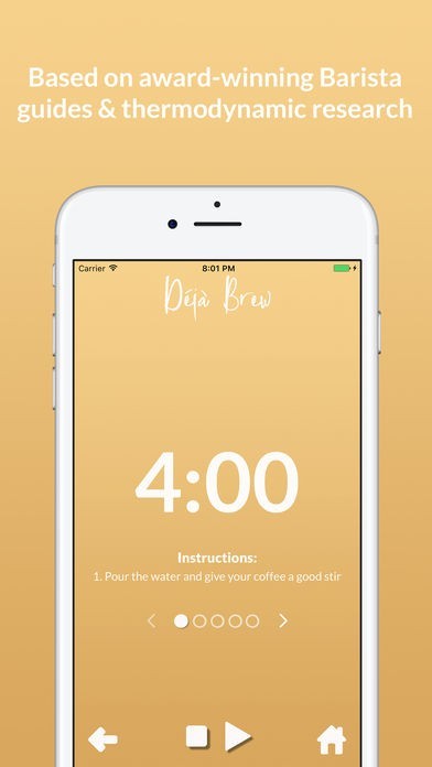 App Storeより引用A simple app with a simple goal: to make you the best cup of coffee. Deja Brew is the smart coffee timer to use with your cafetiere or french Press to give you the perfect cup of coffee each time, every time.