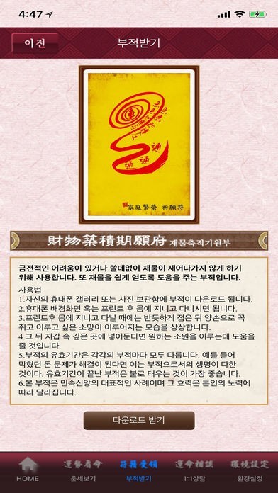 부적을 다운받으신 후 휴대폰 배경화면 또는 인쇄하셔서 몸에 지니고 다니시면 효과를 보실 수 있습니다.