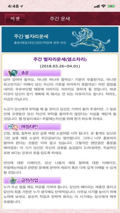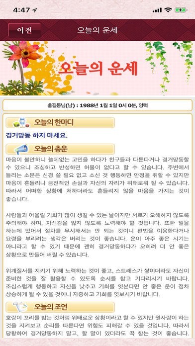 오늘의운세,주간운세를 평생 무료로 이용하실 수 있고,오늘의 운세는 매일 본인이 원하는 시간에 푸시로 받아보실 수 있습니다.