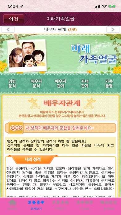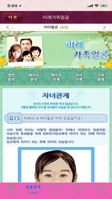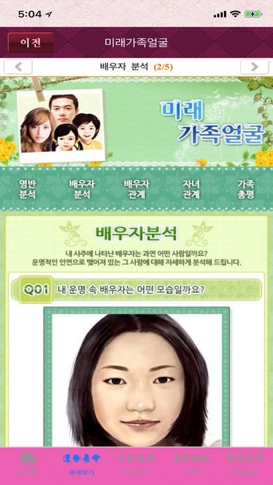 인터넷 및 모바일 운세서비스를 제공하는 헬로우운세에서 유명 역학자와 운세 DB 전문가가 오랜시간 심혈을 기울여서 만든 운세! 나의 미래 가족얼굴을 제대로 보여 드립니다.