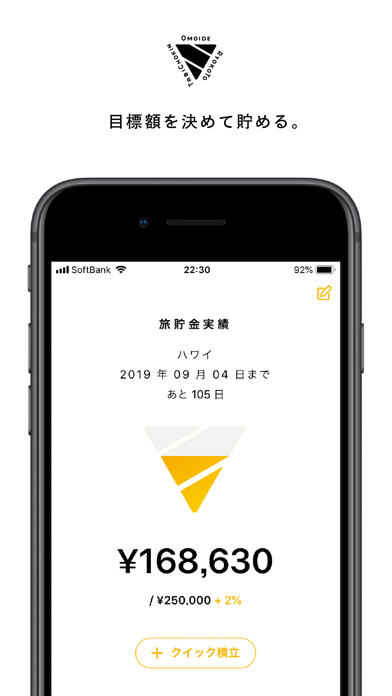 App Storeより引用旅貯金は、旅行資金を自動で積み立てることができるアプリです。旅行の予定にあわせて目標額と満期時期を自由に設定でき、積立額と2%のサービス額を合わせた”旅貯金”を、宿泊、航空券やレンタカーの手配にご利用いただけます。最大の特長は、積立期間に関係なく2%のサービス額が積立額に付与されること。来年の旅行のためにコツコツ貯めるのも、来月の旅行のために一括でも、2%のサービス額が付与されるので、低金利時代に大変お得な積立アプリです。