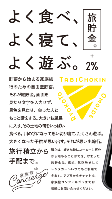 育児や日々の生活が優先され、家族旅行は後回し。家族で帰省したい私は、毎日300円コツコツと積立、年間約100,000円貯蓄。夏休み家族5人で帰省しました。一生の思い出旅行となり、家族の絆は強まりました。この体験・感動から旅行積立アプリ「旅貯金」をスタートさせました。積立は、無理なくお得に着実に貯まる。旅行は、家族の特別な思い出となる。貯蓄から思い出旅行まで、旅貯金がサポートします。