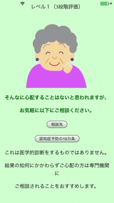 簡単に認知症の診断ができる東京の国分寺市提供のアプリです。大友式認知症予測テストによって認知症の進行具合を診断することができます。数問の質問に答えるだけなのですぐに診断結果が出ます。自分で認知症の診断をする「わたしも認知症?」と家族などの認知症を診断する「これって認知症?」の2つのモードが用意されています。国分寺市民以外も利用可能です。 認知症予防の10ヵ条と題した認知症にならないための対策も載っているので認知症の予防に役立ちます。