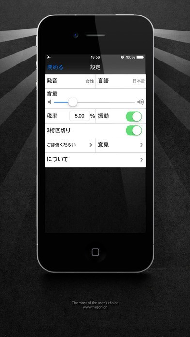 「聞こえる電卓」は音声読み上げ機能がついた電卓です。言語は英語のみですが、音声の発音を「英語」、「日本語」、「中国語」の男女のなかから選ぶことが出来ます。デフォルトではバイブ機能がオンになっていますが、カスタムでオフにすることも可能です。電卓の機能にはメモリー機能や税率計算、%表示、ルートの計算などがついており、日常的な計算に使用する機能はすべて確保されています。計算履歴が残るようになっており、履歴の閲覧や削除を行なうことが出来ます。
