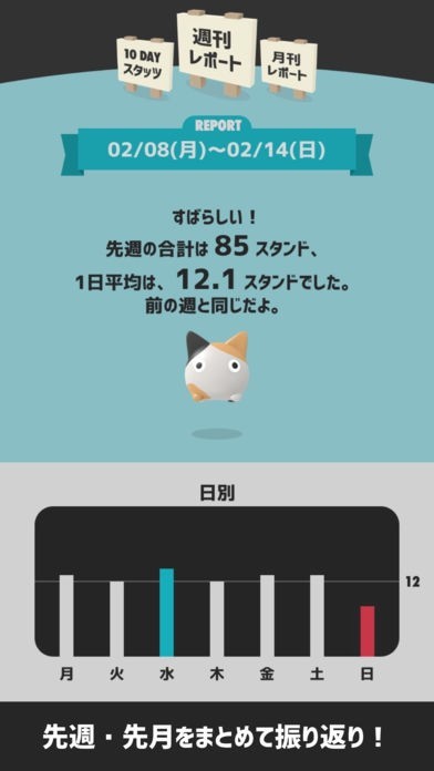 Standlandは、デスクワークなどの運動不足解消を促してくれます。座りすぎにならないように、1時間に1分以上の運動を目指していきます。小さな動物のスタンド仲間が応援してくれます。タップすると話をします。長く座ったままでいると、仲間が寝ているので立ち上がるきっかけになります。 難易度が低いので続けやすく、負担に感じません。目標達成で仲間が増えていきます。グラフ機能があります。1週間の成果を日別に見ることができます。月ごとも見れます。励みになり、平日と休日の違いなど感じることで運動不足にならないように気を付けることができます。