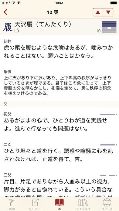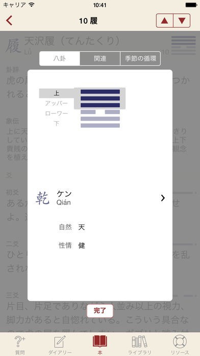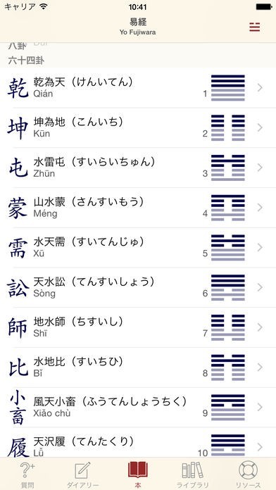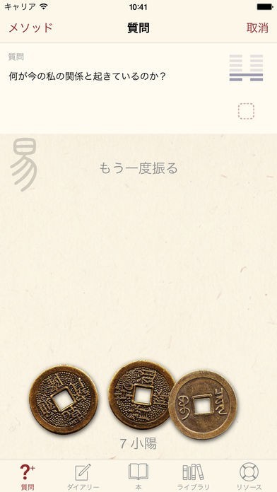 コインを3枚用意して繰り返し投げることで占っていくのが易経です。それをわかりやすくアプリにしています。アプリ内でコインを投げることで実際の易を結果を知ることができます。