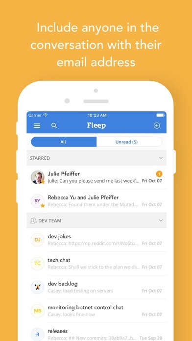 * add people to conversations and teams with their email address - and they will receive messages as emails until they sign up to Fleep;
