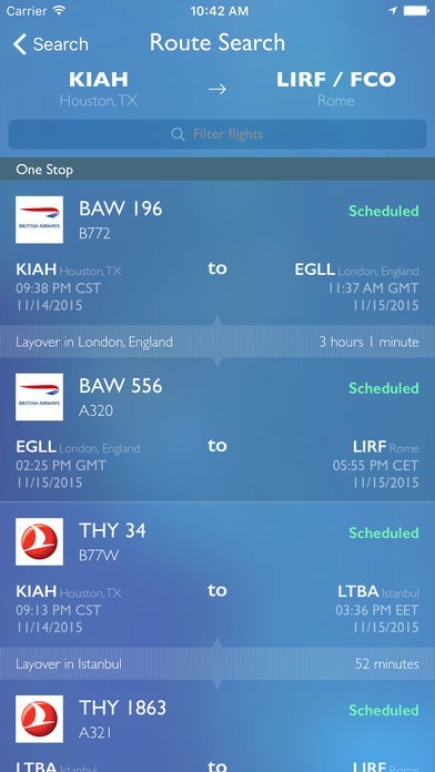 仕事でよく飛行機を利用される方!海外旅行に頻繁にいかれるという方にうってつけなのが「FlightAware Flight Tracker」です。フライト状況を空港や船便、発着時間などのデータから調べることができます。同じ時間帯の飛行機を一括表示してくれるので便利な飛行機を見つけるためにも使えます。また、発着が遅れていたり、キャンセル状態もお知らせしてくれるのでリマインドの役割を果たします。これらの情報はプッシュ通知で伝えてもらうことができるので小まめにアプリをチェックするのが面倒だという方にも便利な機能です。移動中は飛行経路が地図上に表示されるので現在地を把握できるようになります。