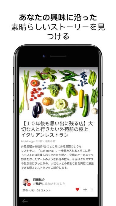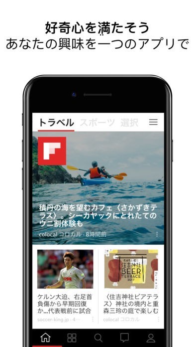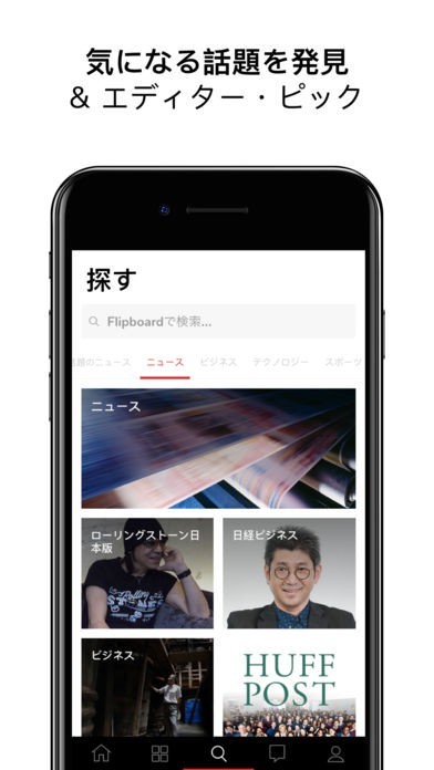 数百万の方々が利用している「Flipboard」によって、いろいろな情報をまとめてチェックすることが可能になります。 よって、いろいろなアプリを使うのが面倒であるという方に向いています。 探すの中から「ニュース」、「テクノロジー」などのカテゴリーをタップして選択すれば、それに関連する情報を確認することが出来ますし、上部の検索ボックスにから直接的にキーワードで探し出すことが出来ます。 また、いいねをしたり、いろいろなストーリーをまとめて雑誌のようなものを作ったり出来、それらは共有することが出来るので、多くの方に見てもらって、コミュニケーションをとることが出来ます。
