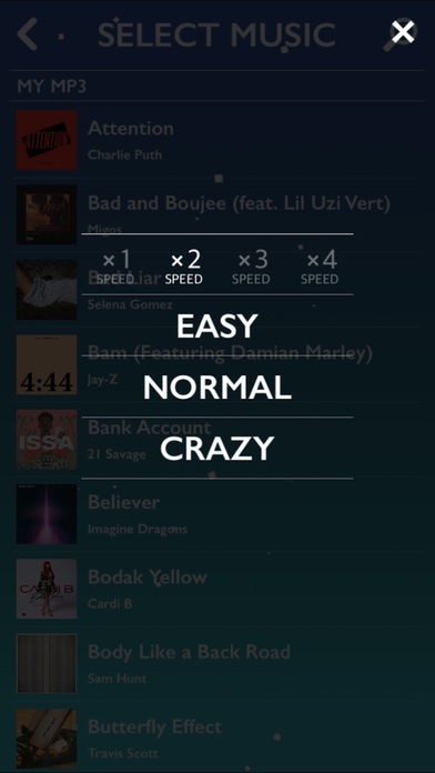 初心者はまず簡単なレベルからプレイしていきます。慣れてきたら高難度の曲にもチャレンジする方法もありますが、目を瞑って簡単な曲をプレイするといった楽しみ方もあります。