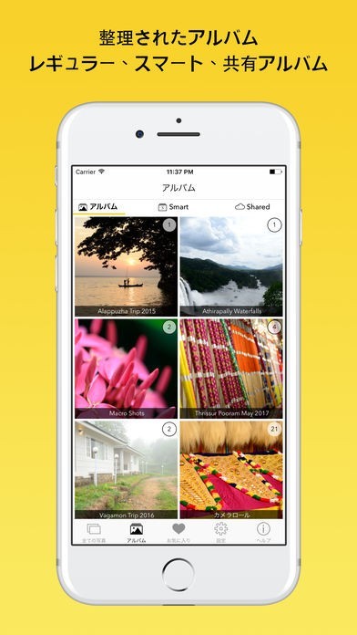 ▸ iPhone 8やiPhone 8 Plus(または3D Touch機能のあるそれ以降のデバイス)に対応しています。「お気に入り」、「フォトストリーム」、「アルバム」、「全ての写真」に素早くアクセスできる機能も搭載し、Exifカードや写真をグリッドビューで閲覧する時には、ピークやポップも使用できます。