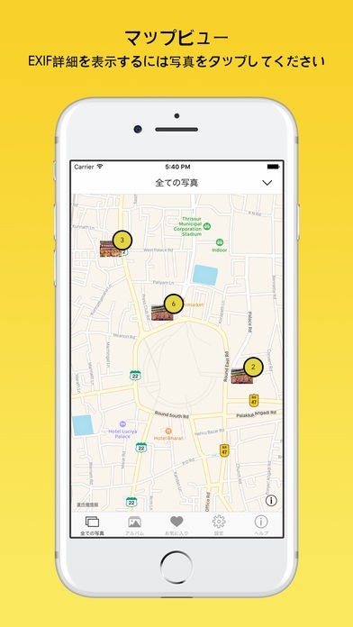 3) マップビューで地図上に写真を表示(付近に位置する写真は、グループ毎にまとまる):写真をタップして個別のEXIF情報を確認(衛星またはスタンダードビュー)