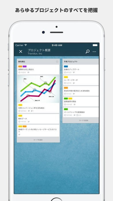 「Trello」はプライベートやビジネスのさまざまなプロジェクトをまとめて管理することができるようになるアプリです。進行しているプロジェクトをカードとして登録することで、ボード上に一覧表示することができるようになっているのでどのプロジェクトがどれくらい進行しているかを一目で確認することが可能となります。各カードにはチェックリストを追加することでToDoリストを作成することも可能となっています。各カードは他のユーザーと共有することも可能となっているので、プロジェクトのメンバー達と一緒に利用することでコミュニケーションを図りながら進めることが出来ます。