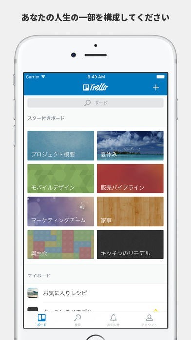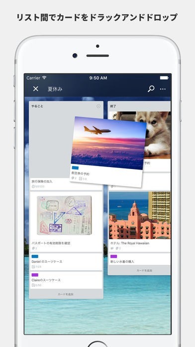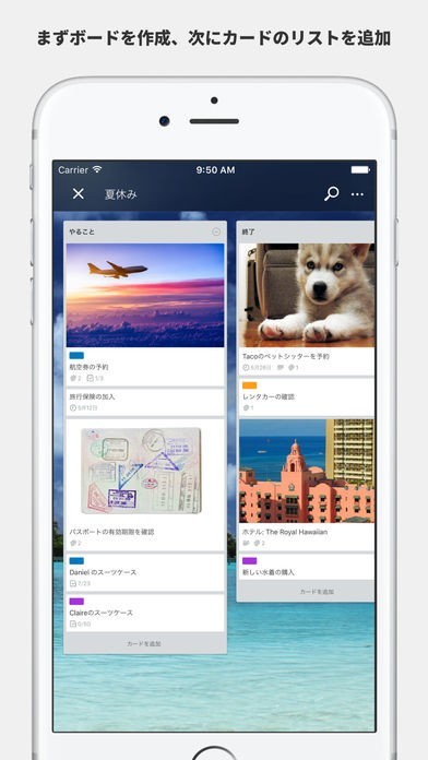 タスクや写真、動画のカードをボードに貼り付けてリストを作成