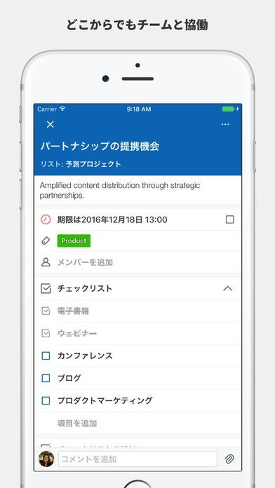 複数人でタスク管理ができるアプリです。一人でも利用できますが、家族や同僚などとの共同作業においてより効果を発揮します。ボードにタスクが書かれたカードを貼り付ける感覚でリストを作っていきます。写真や動画も貼り付けられます。カードはドラッグアンドドロップで移動できます。 タスクを割り振ったり、他の人のタスクにコメントを書き込んだりできるのでスムーズに共同作業ができます。オフラインでした作業でも接続時に自動で同期されるので場所を選ばずに作業できます。