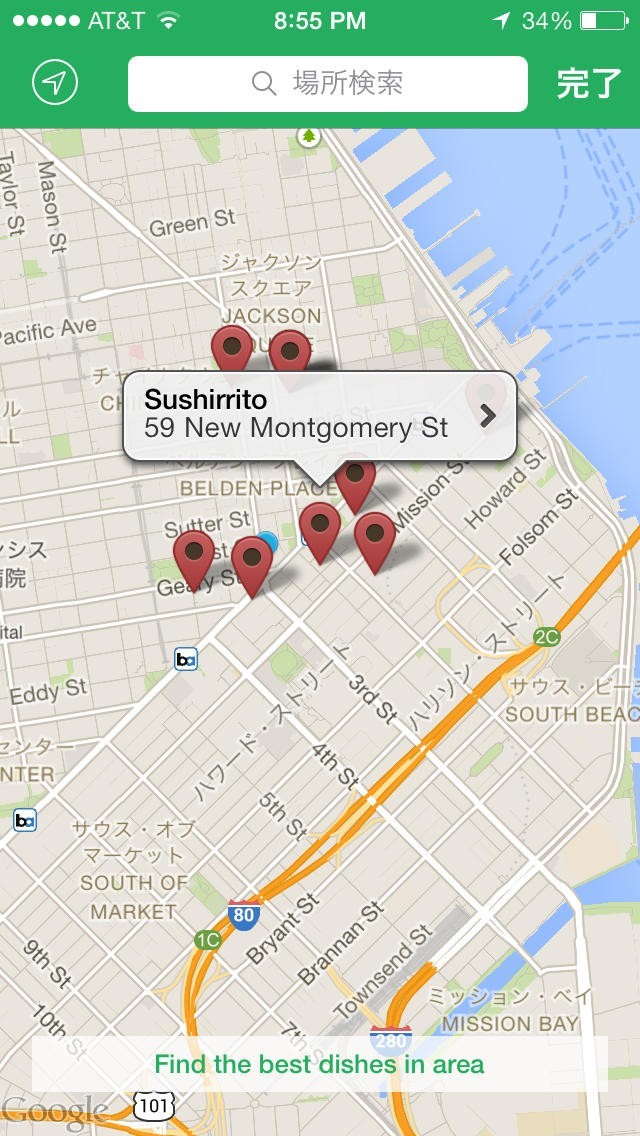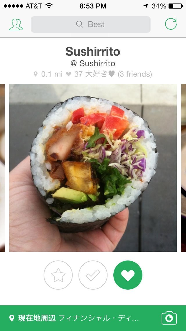 Foodspottingは外出中にお店で出会った料理の写真を共有するためのSNSアプリです。気に入った料理の写真を撮ったら、そのメニューを出したり売ったりしているお店を入力して投稿します。投稿された写真は、お店から比較的近い地域にいるユーザーのトップ画面にリストされ、料理を気に入った人が気軽に食べに行けるようになっています。トップ画面は、料理のサムネがピンで表示されるマップモードに切り替えることもでき、どの料理がどこで食べられるのか俯瞰的に見ることもできます。