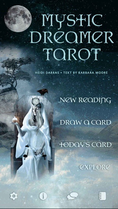App Storeより引用By moonlight the Mystic Dreamer Tarot invites you into a realm of imagination and intuition. What secret messages do your dreams hold? The Tarot journey is presented as a Gothick dreamscape, ethereal and luminous. Introspective questions for each card guide your journey within, as you enter the Mystic Dreamer’s world of personal exploration.