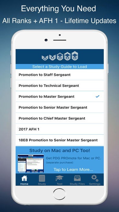 PDG PROmote is an application aimed to prepare Airmen who are taking the Air Force Promotion Fitness Examination (PFE) or the USAFSE-United States Air Force supervisory examination. Its sole source of reference is The Study Guide for Promotion to (SSgt, TSgt, MSgt, SMSgt, and CMSgt), 1 October 2017. All study guides are sourced from Air Force Handbook 1 (AFH 1) dated 1 October 2017. Just select the appropriate study guide for the promotion grade that you are testing to and begin studying!