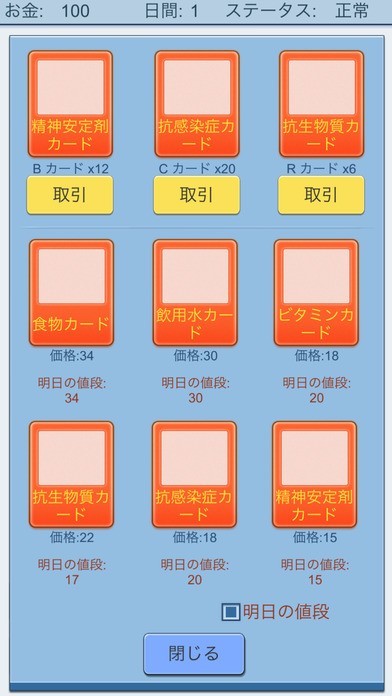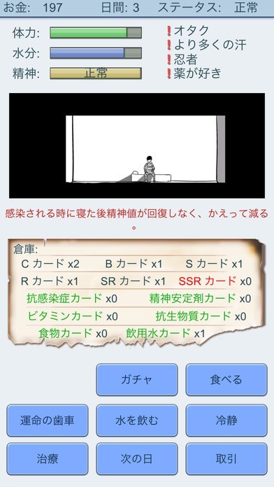 -これもサバイバルゲームですから、まずは生きていってください。食べ物、水、薬など、全てはカードとして引いて入手します。病気になることも可能ですから、できれば早く治してください。