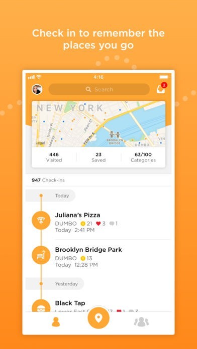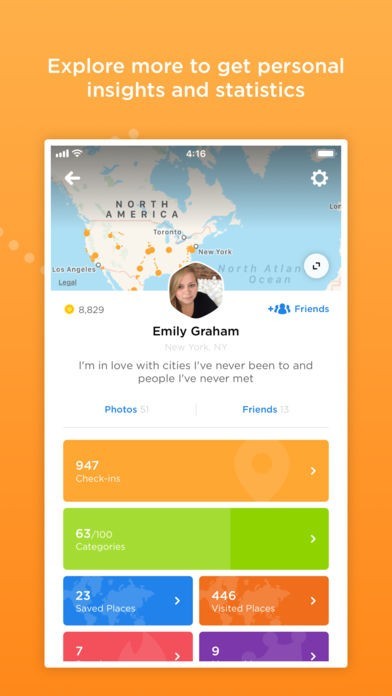 「Swarm」では、訪れた経験があるような場所をオレンジ色で記録しておくことが出来ます。 よって、世界中を仕事や旅行などで飛び回っているような方に使用をして欲しいです。 「チェックイン」、「スポット」、「カテゴリー」、「連続記録」、「メイヤー」を記録しておけて、訪問数が多い国順などに並び替えることが出来たり、さらには誰と一緒に行ったのかということも記載してあるので旅の思い出を思い出すのにも使えます。 他にはフレンドがどこに行ったのかということも見れるので、会話のきっかけとして利用したり、近くにいることがわかったのならば会いに行ったりも出来ます。