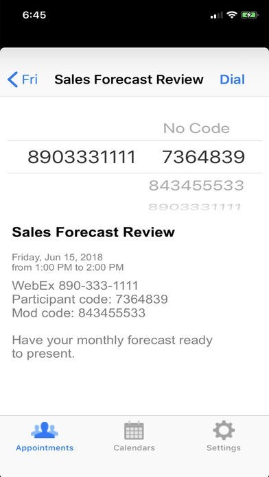 ApptDialer automatically detects phone numbers and meeting identifiers from anywhere in the appointment. That’s right, anywhere, even if they’re tucked away in the location field or notes. If you have multiple numbers listed, simply select the one you want to use and the app will call the number and enter the code for you. Safe, easy and the perfect solution to conferencing while on the go.