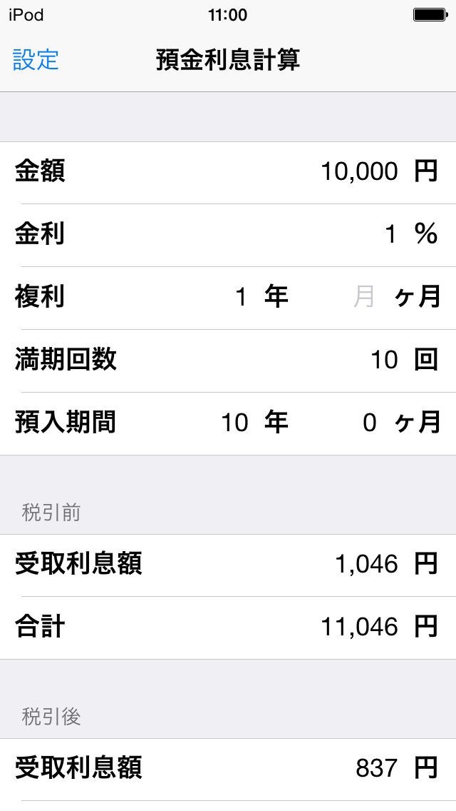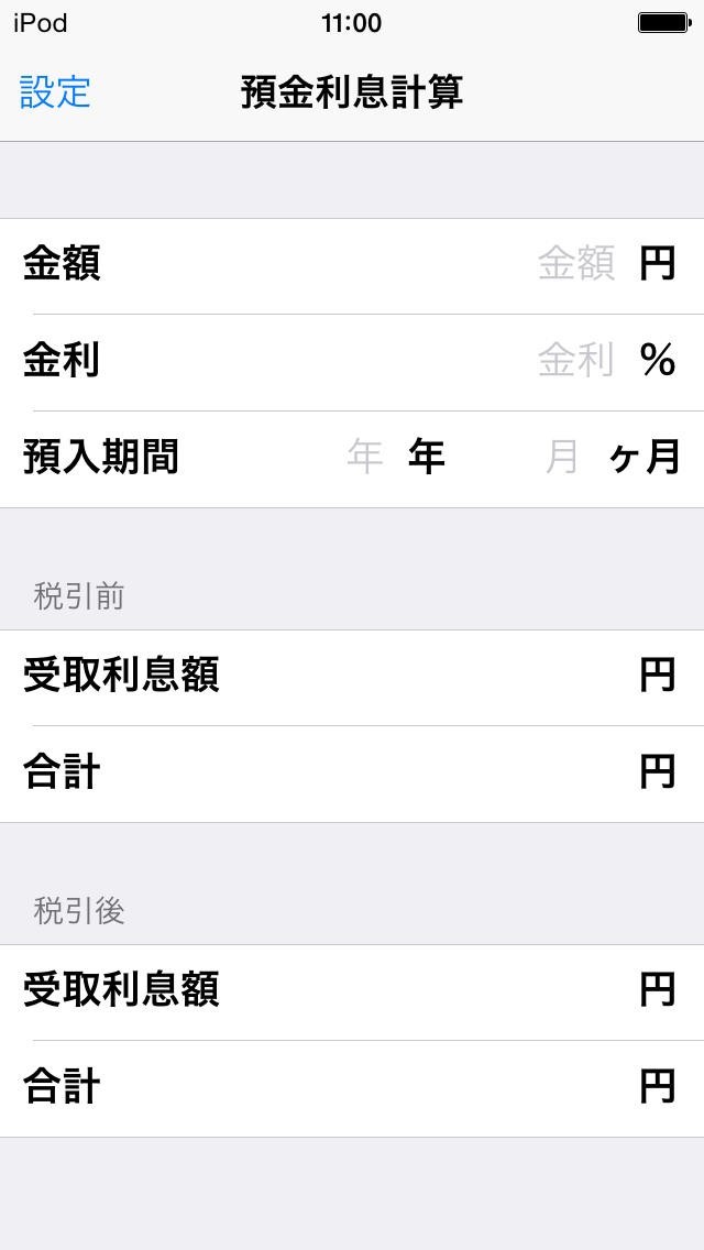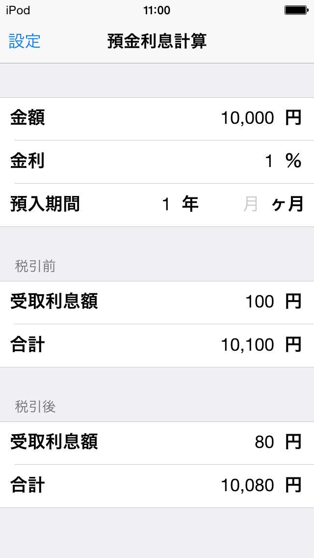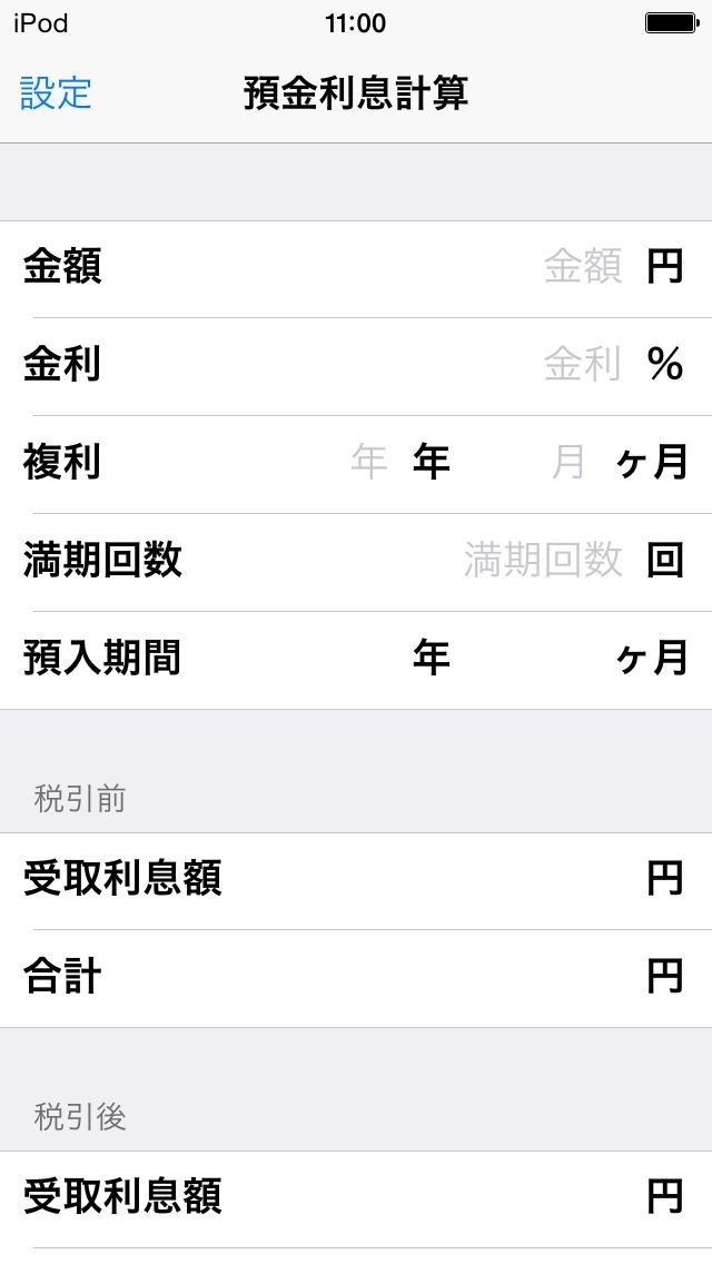 ・金額、金利、預入期間を入力すると、受取利息額が表示されます。