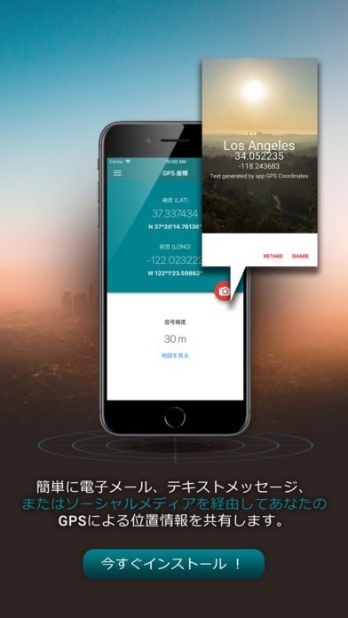 App Storeより引用簡単に電子メール、テキストメッセージやソーシャルネットワーキングサイトを経由して、あなたのGPSの位置を共有します。Googleマップのおかげで、あなたの座標を使って場所を見つけることができます。最高のローカライズあなたは晴れた日中に外にされて得ることができることに注意してください。自宅での座標を取得しようとすることは難しいかもしれないので、それはめちゃめちゃ重要です。緯度と経度は小数点形式と6両方(度/分/秒)形式で表示されています。インターネットデータ接続は必要ありません。
