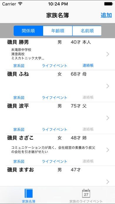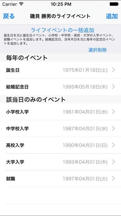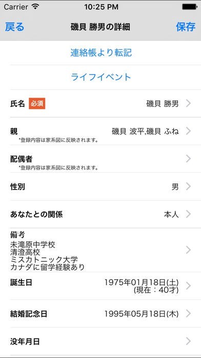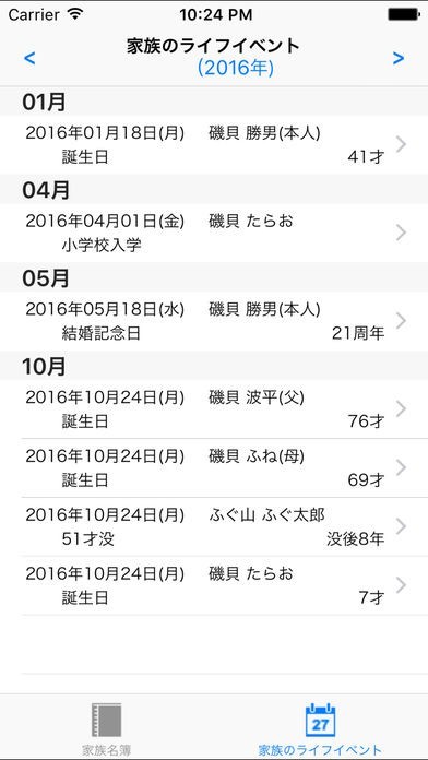 忘れてしまいがちな家族の生年月日を保存することが出来ます。また、履歴書を書くときなどに便利なライフイベント一覧表示機能が搭載されているので、経歴を正確に書き写すことが出来ます。