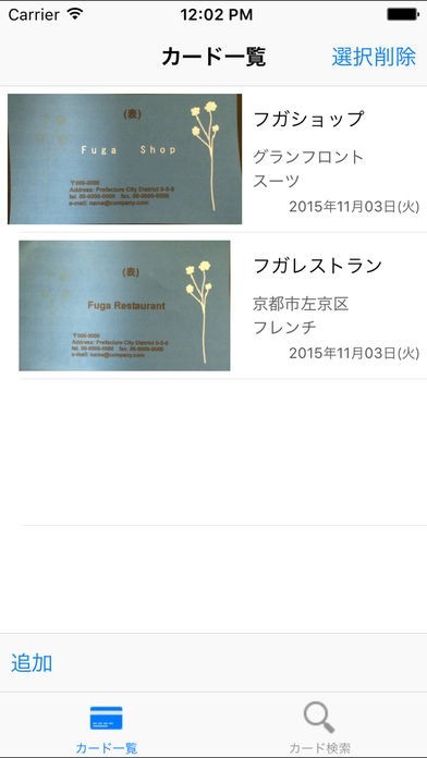 カードリストの一覧表示をすると、カードの画像はもちろん、お店の名前やジャンル、場所、登録日がすぐにわかるようになっています。いかなくなったお店の情報も簡単に削除できるのでカードリストの一覧表示をすると、カードの画像はもちろん、お店の名前やジャンル、場所、登録日がすぐにわかるようになっています。行かなくなったお店の情報も簡単に削除できるので、常に見やすいリストを保っています。