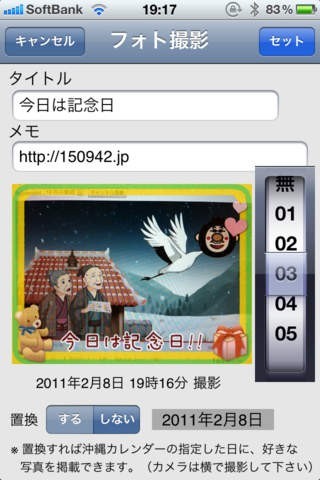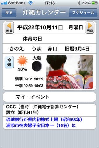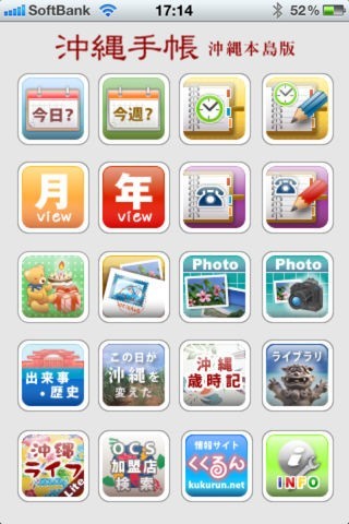 「手帳」に必要な「カレンダー表示機能」「年中行事表示機能」「沖縄イベント表示機能」「マイ・イベント登録機能」「スケジュール登録機能」「アドレス帳登録機能」「フォトアルバム表示機能」「絵はがきメール送信機能」「日めくりカレンダー機能」をチャンプルし、「沖縄の出来事」「この日が沖縄を変えた」などの記事を満載しています。