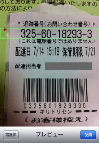 11〜13桁の「追跡番号(お問い合わせ番号)」または、6〜8桁の「お知らせ番号」をOCR読み取りして、再配達ウェブフォームに自動入力します。