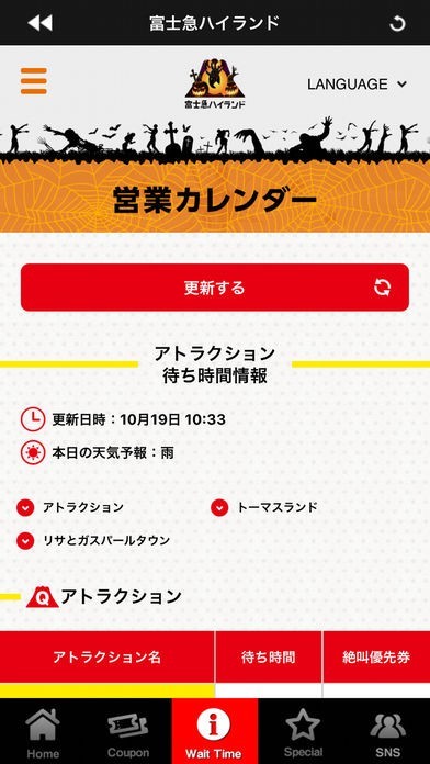 富士急ハイランドアプリは園内の様々な案内やクーポン、イベント情報が用意されているため、まず事前調査で使うのがおすすめです。また、園内では地図による案内や混雑状況の案内が使えるので便利です。