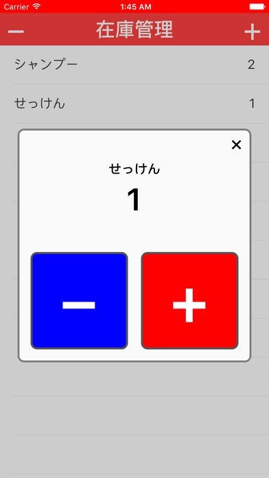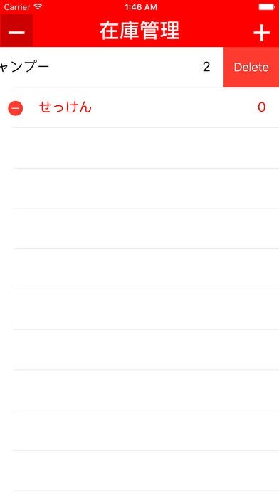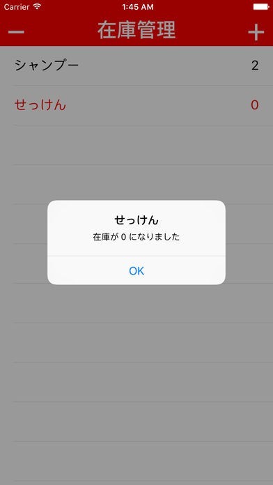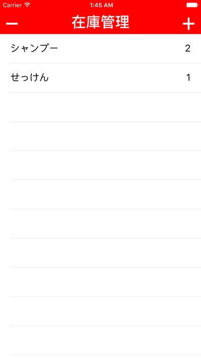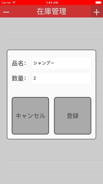 App Storeより引用在庫を管理するアプリです。+ボタンから品名と数量を入力し、登録ボタンを押下すると在庫リストに商品が追加されます。数量を増減させる時はリストの商品を選択します。+/ーボタンを押下して1ずつ数量を増減させます。