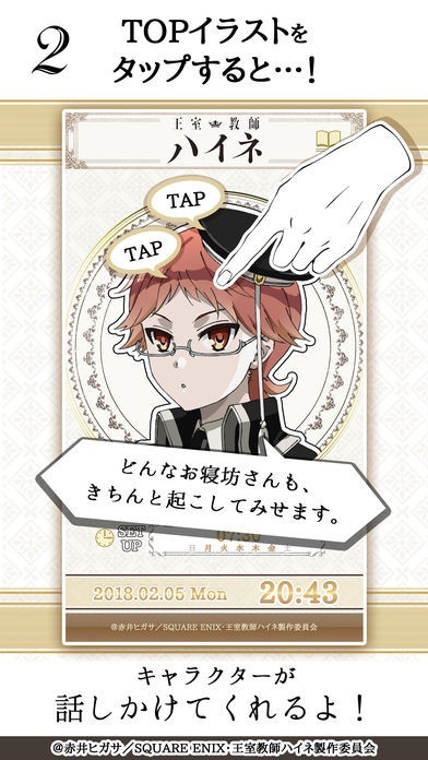 アプリの待ち受け画面にタッチすることで、ハイネが直接話しかけてくれる機能が付いています。こちらではアラームとは別のセリフを聞いて楽しむことが出来るようになっています。