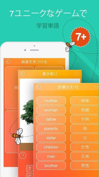 楽しく英単語を学ぶことができるゲームが7種類用意されています。例えば、カードに表示されている単語を選択したり、ネイティブの発音を聞いて該当する単語を見つけることができます。