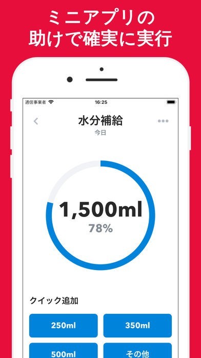 一日の目安となる水分補給や・ウォーキング、さらにはエクササイズなどの様々な項目を一カ所で管理することが出来ます。手間が省け、より効率の良いトレーニングが行えます。