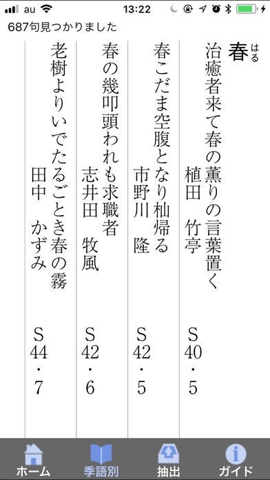 俳句から季語の抽出を行うことができます。抽出結果は縦書きで表示され、作者名と作成年月日が判るのも嬉しいポイント。同じ季語を使った俳句を確認しながら、作者ごとに異なる個性を楽しめます。