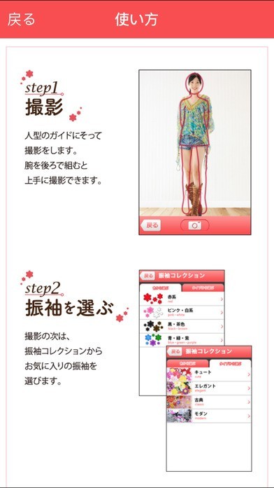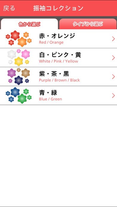 使い方は簡単!自分やお友達の姿をスマートフォンのカメラで撮影し、振袖のイメージと重ね合せます。振袖は、赤系、ピンク・白系、黒・紫系、青・緑・黄系の「色」から選ぶことができるのはもちろん、キュートやエレガント、古典・レトロ、モダンなど、「タイプ」でも選択できるので、お気に入りの振袖を探すのにとっても便利!